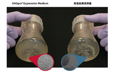圖2. 使用Mirus CHOgro? High Yield Expression System中的CHOgro? Expression Medium進(jìn)行培養(yǎng)(左),細(xì)胞結(jié)塊數(shù)量顯著少于其他培養(yǎng)基培養(yǎng)的CHO-S細(xì)胞(右)。