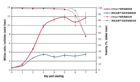 圖3. 使用CHOgro? Expression Medium培養(yǎng),CHO細(xì)胞密度更高,并且保持著較高細(xì)胞活性。
