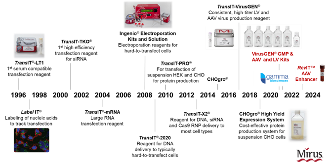 Why does the Mirus TransIT-X2® Dynamic Delivery System possess such high performance and broad adaptability? This is attributed to Mirus’ powerful and efficient patented delivery platform design, which enables screening and optimization of transfection reagent components for multiple and multifunctional combinations. Founded in 1995, Mirus has focused on and specialized in the field of nucleic acid delivery for many years (Figure 1). From the earliest low-toxicity TransIT®-LT1 to the GMP-grade TransIT-VirusGEN® (which can be used for AAV and LV production), all products are designed and developed based on this delivery platform. To date, more than 10,000 research papers have been published using Mirus products, and these papers and Mirus’ database cover over 1,200 cell types. For more papers and data queries, please click here.