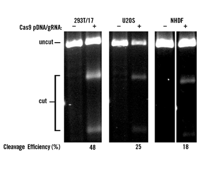 The TransIT-X2® Dynamic Delivery System (2 μl/well in 24-well plates, Mirus Bio) was used to co-transfect 0.5 μg of plasmid DNA (expressing Cas9 protein) and 50 nM of 2-part gRNA (targeting the PPIB gene) into HEK293T/17, U2OS, and NHDF cells. At 48 hours post-transfection, T7E1 assay was performed to verify the cleavage efficiency.