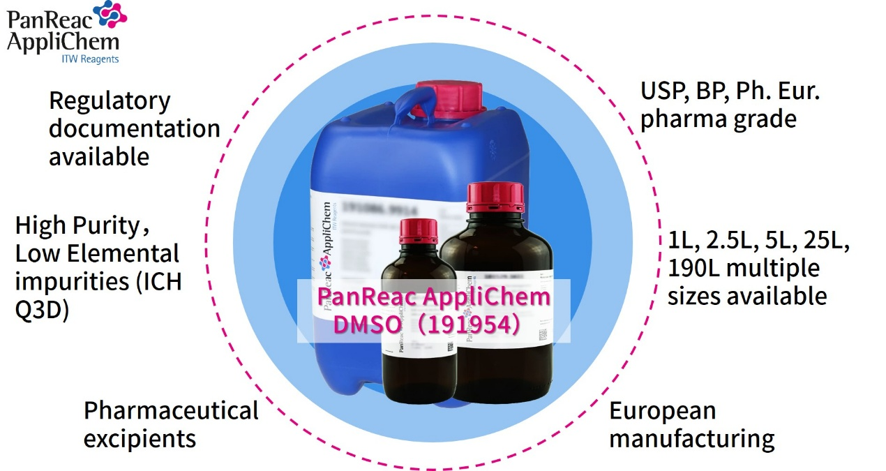 PanReac AppliChem’s pharmacopoeia-grade dimethyl sulfoxide (Catalog No.: 191954) is manufactured in Europe. Featuring high purity, ultra-low metal ion content, and compliance with the ICH Q3D quality standard, it meets the requirements of multiple pharmacopoeias including USP (United States Pharmacopeia), Ph Eur (European Pharmacopoeia), and BP (British Pharmacopoeia). With superior quality at a competitive price and stable supply, it is available in various specifications (1L, 2.5L, 5L, 25L, 190L) to meet the needs of different applications and process stages. It has long been widely favored by customers worldwide.