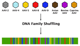 AAV共有12個血清型,其中AAV1-6是從人類組織中分離獲得,并且具有明確的的抗體反應(yīng)性,是目前常用的經(jīng)典AAV載體。盡管不同血清型AAV都具有正二十面體結(jié)構(gòu),但其衣殼蛋白在序列與空間構(gòu)象上的多樣性,使得AAV與不同細胞表面受體親和力及組織嗜性存在顯著差異。在感染嗜性方面,AAV-2的感染譜較廣應(yīng)用較多,AAV-1在骨骼肌中的轉(zhuǎn)導(dǎo)效率較高,AAV-3易于轉(zhuǎn)導(dǎo)巨核細胞,AAV-5和AAV-6感染呼吸道上皮細胞的優(yōu)勢較為顯著。因此,根據(jù)AAV不同血清型在組織感染性的相對特異性,可以用于在針對不同靶向組織的基因治療中尋求最佳的AAV載體類型與組合。除了常見的六個血清型AAV之外,Cell Biolabs還提供兩種重組型AAV包裝質(zhì)粒即AAV-DJ與AAV-DJ-8,如下圖所示,這兩種AAV的Rep-Cap基因是由多個野生型AAV的結(jié)構(gòu)基因重組而來,與其他野生型相比,AAV-DJ在體外細胞轉(zhuǎn)導(dǎo)效率更高,AAV-DJ-8則更適用于體內(nèi)感染實驗。